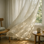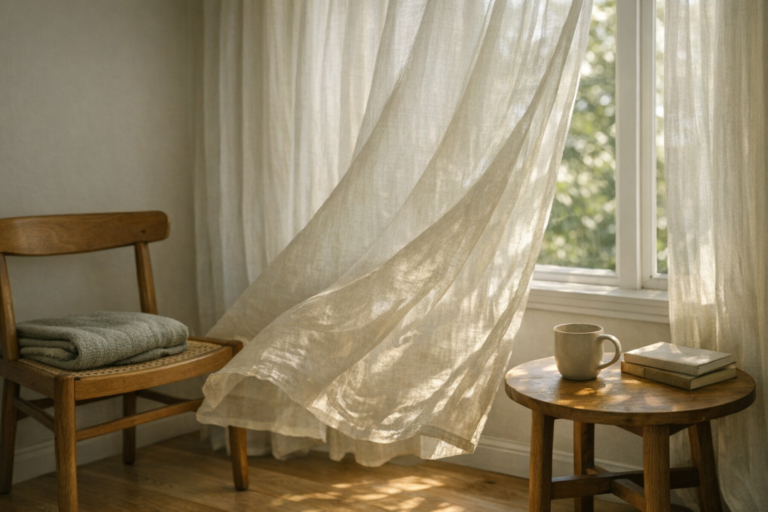 A long-form DewFrame visual essay on curtains, moving air, and the subtle domestic moments that shift a room before daylight...